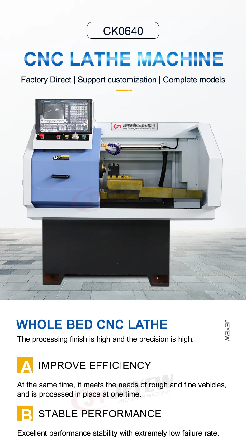 CK0640 CNC lathe machine is made of high-rigidity cast iron with an integral casting structure, which is 30% more rigid and stable than the integral bed foot structure. It is molded with resin sand and has been treated with aging. High-precision and high-strength ball screws are used for feed in X and Z directions;high-efficiency arranging tools are used as standard, and the tool change efficiency is high. Four-station CNC vertical electric tool holders are optional, with high precision and stable rotation , No lifting action is simple and other features.